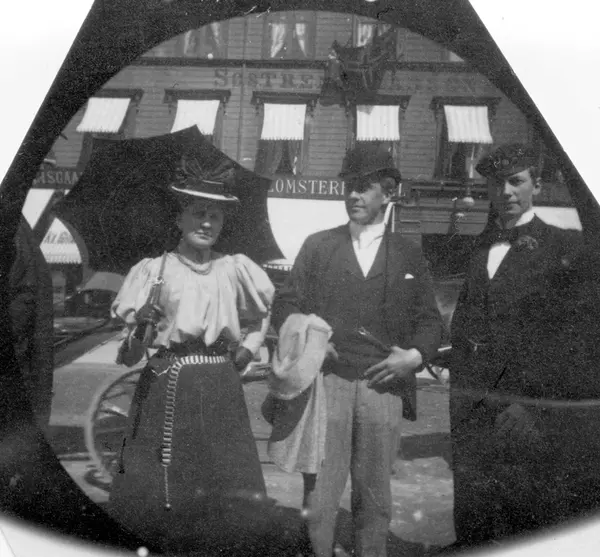To menn og en kvinne står foran Søstrene Larsens Hotell på Karl Johans gate, Oslo.