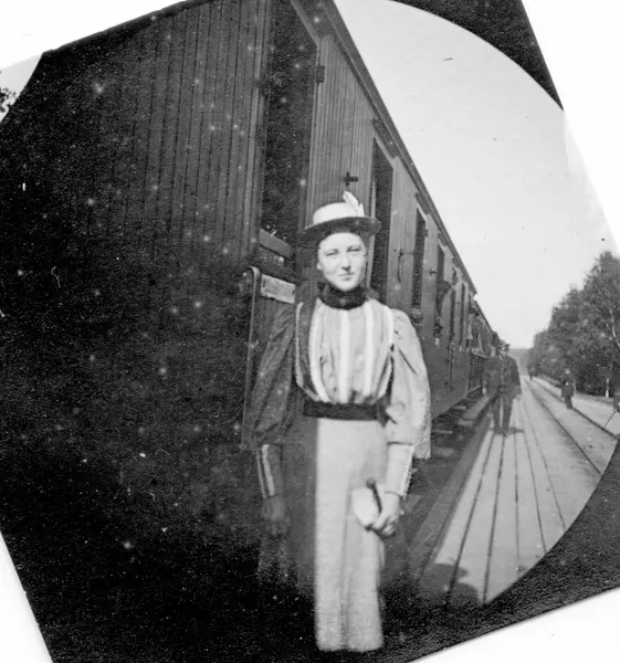 Frk. Marstrander står ved siden av jernbanevogn på perrongen. Konduktøren kommer gående bak.