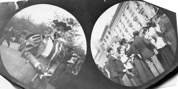 Frk. Ada Clausen, senere fru professsor Srørmer, i park til venstre. Mennesker i bygate 17. mai til høyre. Begge ant. på Karl Johans gate, Oslo.