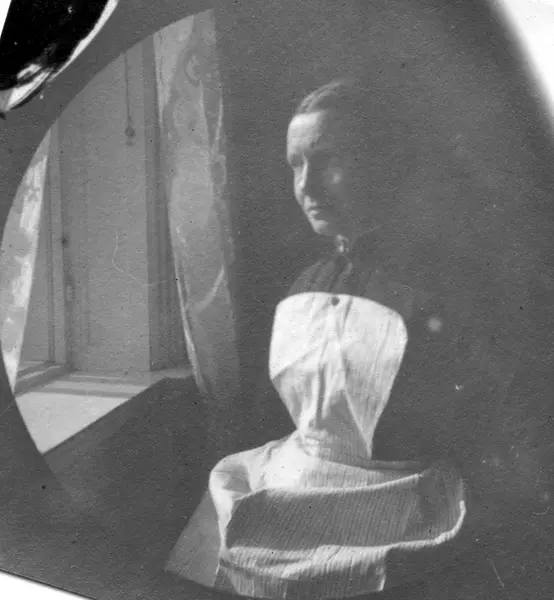 Beathe Larsen, kokkepike hos apoteker Størmer, med hvitt forkle, sitter ved vindu.