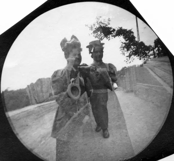 Frøknene Hvistendahl spaserer i gate med skog i bakgrunnen.