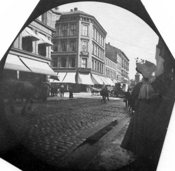 Frk. Lilly Heiberg ant. på Karl Johans gate, Oslo. Butikker med markiser.