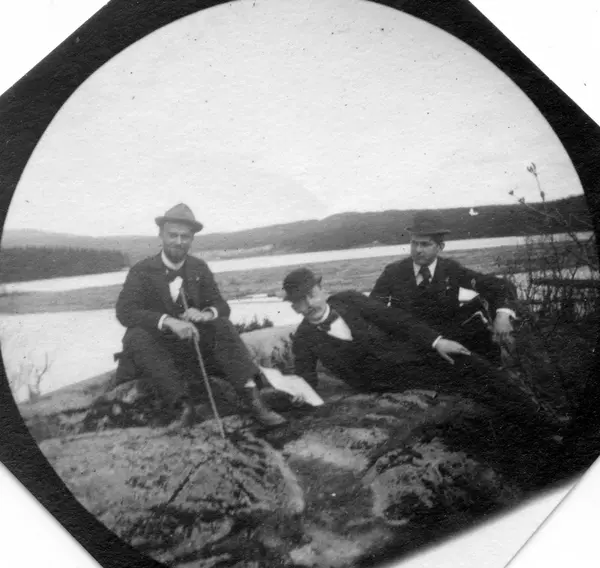 Tre menn sitter ved Sognsvann, Oslo. Fra venstre dr. Carda, Wien, professor Kristian Birkeland, og professor E.O. Lavett, Houston, Texas.