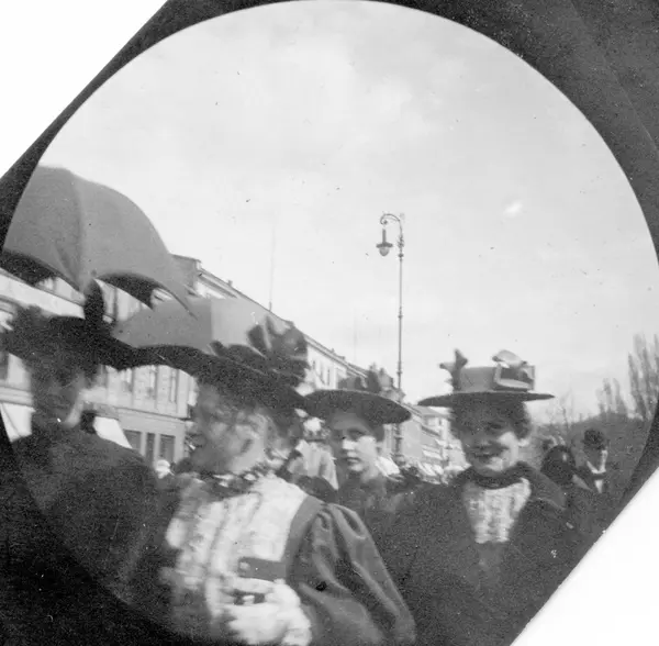Kvinner i bygate, ant. Karl Johans gate, Oslo. Under lykten, frk. R. Moe fra Tøyen.