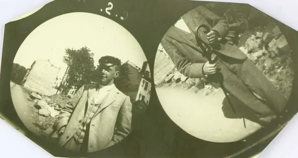 Carl Størmer står i gate med bygårder i ryggen. Bilde til høyre er Niels Heitmann, student fra 1892, uten hode.