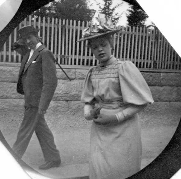 Herman Reimers og Bolla Nissen spaserer i gate langs gjerde, ant. Oslo.