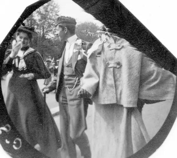 Frk. Signe Hvistendahl, frk. Agnes Hvistendahl og Herman Reimers spaserer langs park på 17. mai, ant. Oslo.