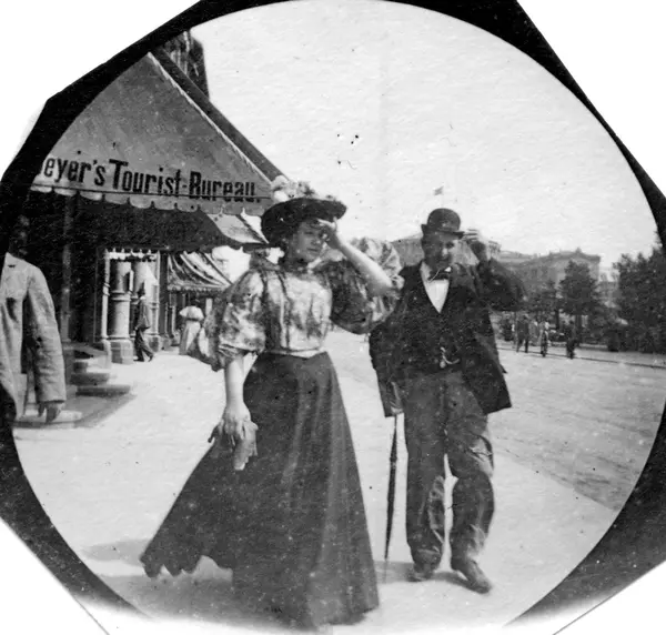 Mann og kvinne spaserer langs Karl Johans gate, Oslo. Markise merket "Beyer`s Tourist- Bureau".