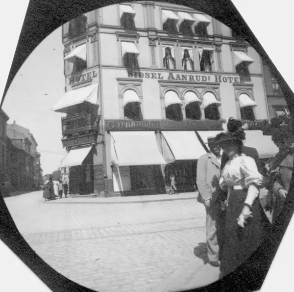 Mennesker i bygate. Sidsel Aanrud´s Hotell, ant. Oslo, med garnhandel i 1. etasje.