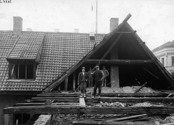 Dronningens gate 15, Det gamle Finansdepartement, Oslo. Rivningsarbeider på taket.