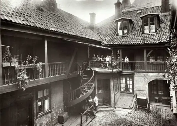 Kirkegata 7, Oslo. Bygning mot bakgård med svalgang, vindeltrapp, vannpost og dragkjerre.