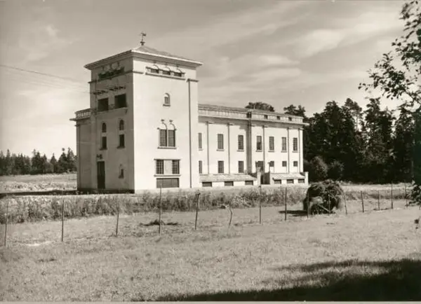 Smestad, Oslo. Transformatorstasjon. Tegnet av arkitektene Berner & Berner. Bygning bak tom høyhesje og hest med høyvogn.