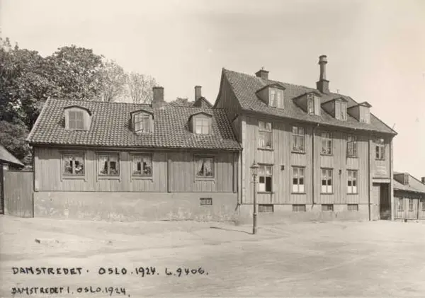 Bolighus i Damstredet 1, Hammersborg, Oslo. 1924. Bilde tatt fra gata.