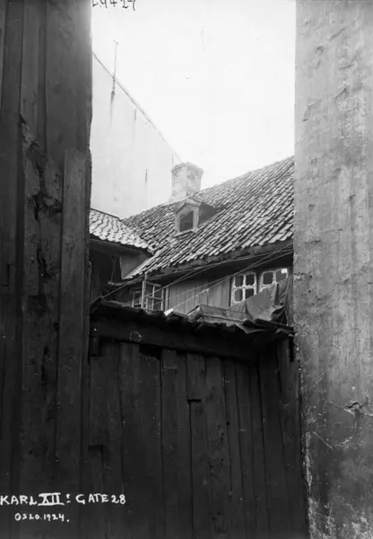 Karl XIIs gate 28, Oslo, 1924. Hus mellom to vegger i bakgård.