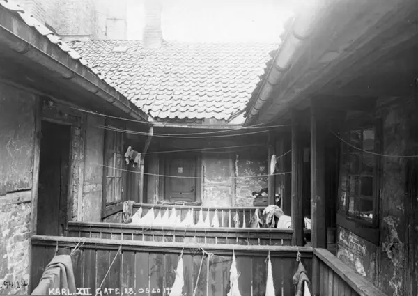 Karl XIIs gate 28, Oslo, 1924. Svalgang med bru og klesvask i bakgård.
