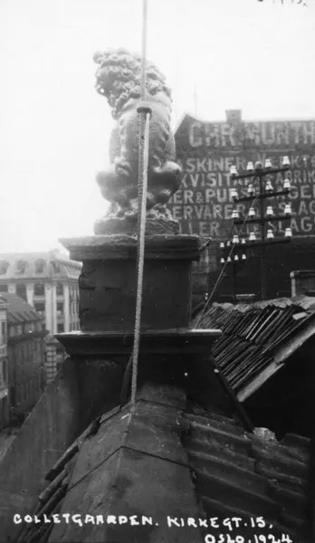 Colletgården, Kirkegata 15, Oslo. Statue av løve på taket. Nå på Norsk Folkemuseum.