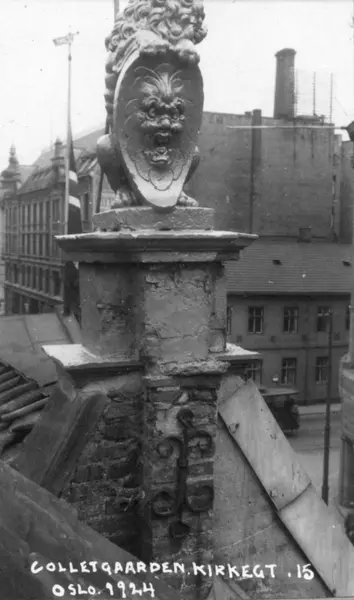 Colletgården, Kirkegata 15, Oslo. Statue av løve på taket. Nå på Norsk Folkemuseum.