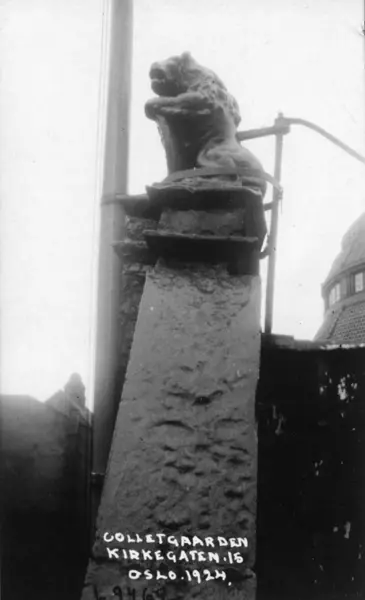 Colletgården, Kirkegata 15, Oslo. Løveskulptur på taket. Colletgården er nå på Norsk Folkemuseum.