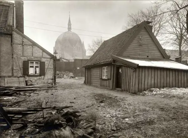 Kanten 1, Hammersborg, Oslo. Gårdsplass med gamle hus mot kirke.