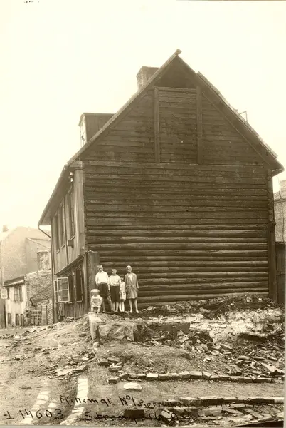 Mellemgata 1, Pipervika, Oslo. Barn foran tømmervegg i husrekke.