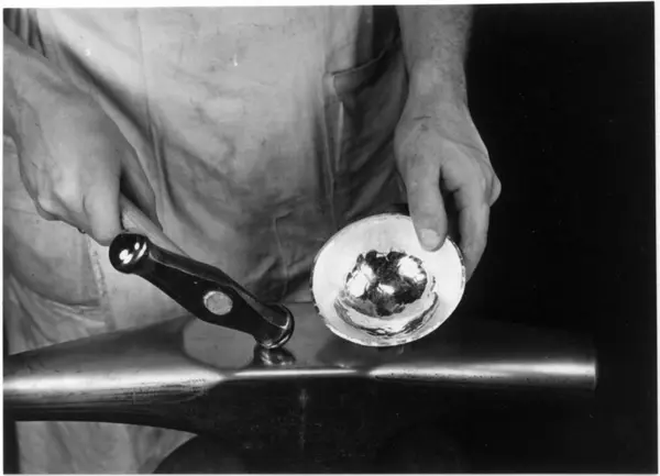 Opptrekking av beger med knopphammer. Gullsmedverksted, J. Tostrup, Oslo.