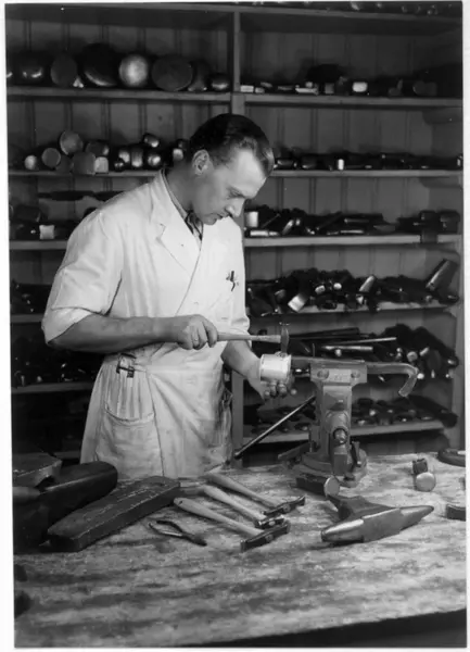 Sølvarbeiderer planerer beger med planerhammer. Gullsmedverksted, J. Tostrup, Oslo.