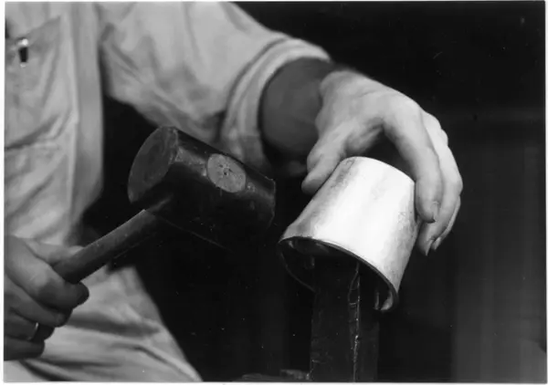 Kanten slås inn med hornhammer? (trehammer?) på opptrukket beger for å rette vegger. Gullsmedverksted, J. Tostrup, Oslo.