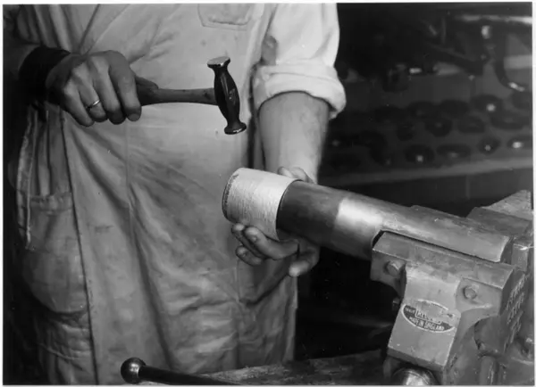 Planering av beger med planerhammer på begerjern. Gullsmedverksted, J. Tostrup, Oslo.