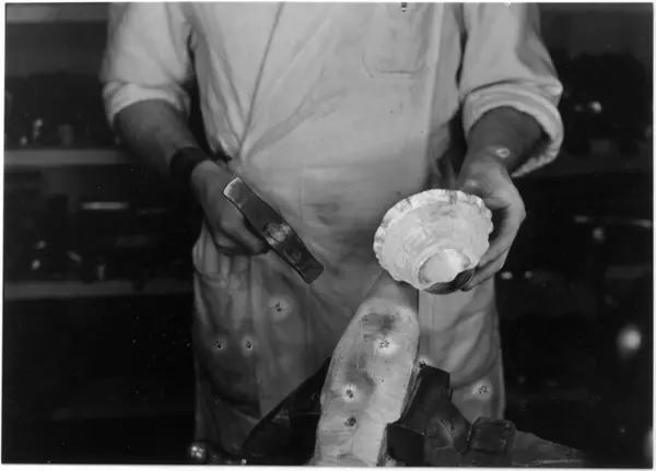 Arbeid med beger. Foldene i sølvblikket slåes ut med opptrekkshammer. Gullsmedverksted, J. Tostrup, Oslo.
