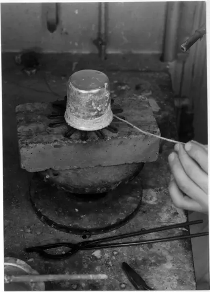 Arbeid med beger. Munningsrand på beger loddes (sølvtråd). Gullsmedverksted, J. Tostrup, Oslo.