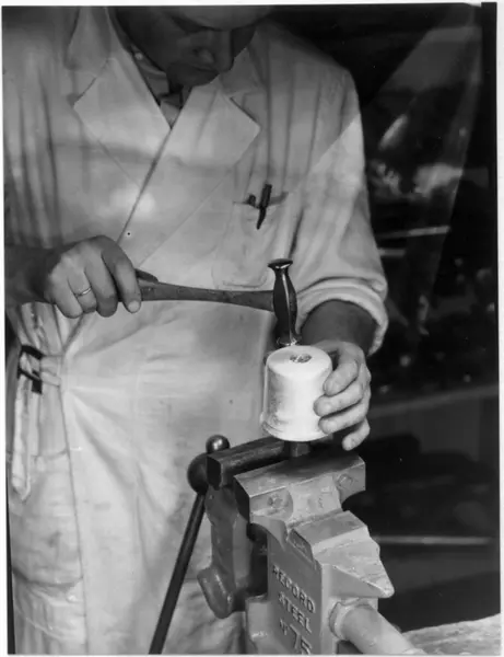 Fra en serie fotografier som viser arbeid ved gullsmedverkstedet J. Tostrup i Oslo, 1951.