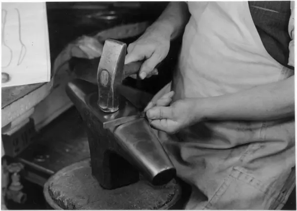 Skjearbeideren i arbeid med skje. Gullsmedverksted, 1951. J. Tostrup, Oslo.