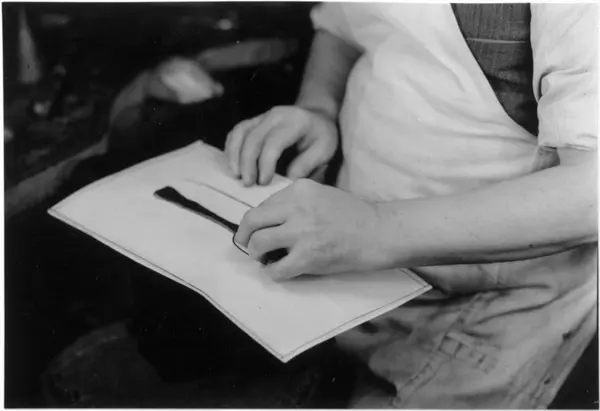 Skjearbeider kontrollerer skje mot tegningen. Gullsmedverksted, J. Tostrup, Oslo.