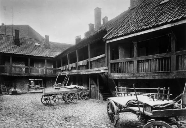 Brugata 6, Oslo. Gårdsrom med kjerrer. Bondehandelsgård bygd av Arne Hansen Killerud i 1760- årene. Brant 1988.