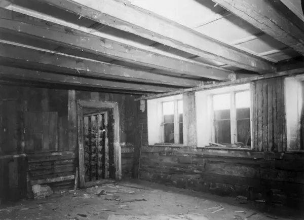 Rødfyllgata 20, Oslo 1954. Under riving. Interiør etter panel og brystning er tatt av og takbjelkene avkledd.