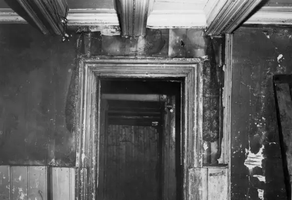 Rødfyllgata 20, Oslo 1954. Under riving. Dør, brannmur, vegg og himling etter at strien er tatt av.