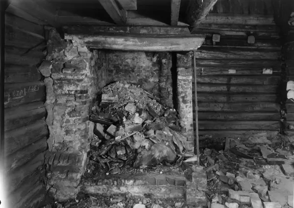 Rødfyllgata 20, Oslo 1954. Peis under riving i rom med tømmervegger.