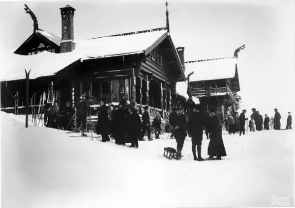Frognerseteren, Oslo. 1908-1910. Vintermotiv. Skiløpere og akende.