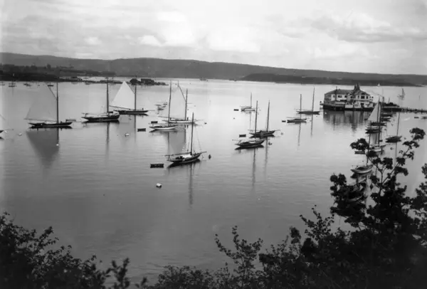 Frognerkilen, Bygdøy, Oslo 1908-1910. Oversiktsbilde. Utsikt mot Dronningen. Seilbåter ved bøyer på vannet.