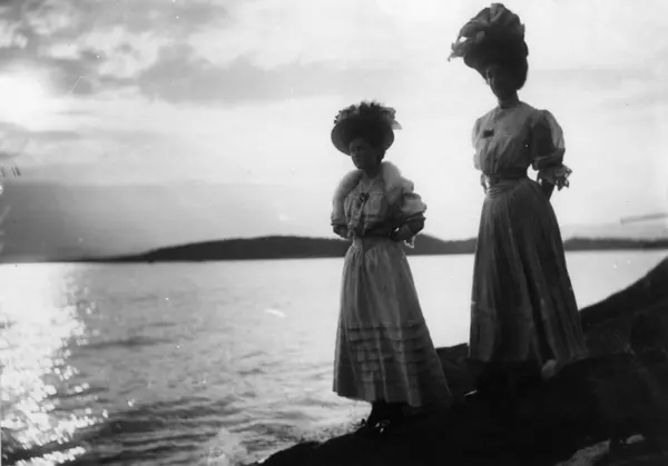 Drakt. Oslo 1908 - 1910? Fjordlandskap? I forgrunnen to kvinner i lange kjoler. Bærer hatter.