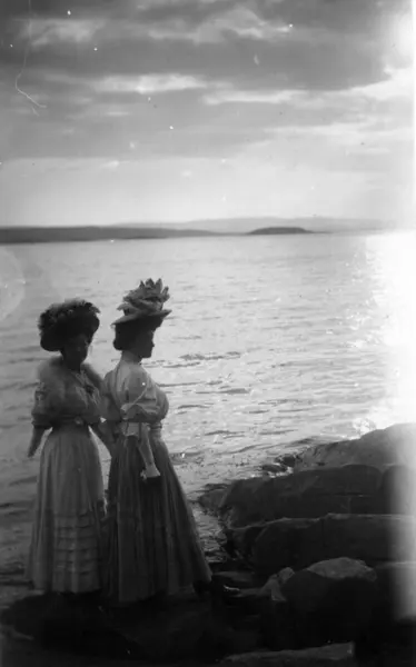 Drakt. Oslo? 1908-10. Fjordlandskap? I forgrunnen to kvinner i lange kjoler. Bærer hatter.