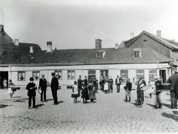 Lilletorget, Oslo ant.1880-årene. Storgårdsundersøkelser ved dr. Engelstad sommeren 1954.Mennesker på plass med brostein, foran lavt murhus med forretninger. P Schøyen, brennevinshandel. Fra dr. Eivind S. Engelstads storgårdsundersøkelser 1954.
