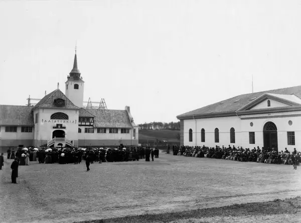 Den kulturhistoriske utstilling åpnes på Norsk Folkemuseum i Oslo 1901. Pariserpaviljongen bak kirken er ennå ikke ferdig. Mange mennesker tilstede.