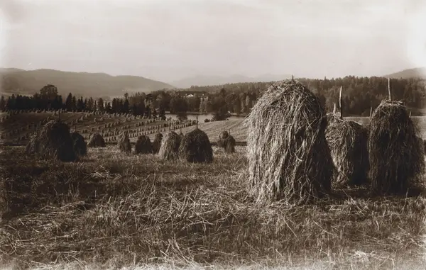 Landskap, Bogstad, Oslo. Oversiktsbilde med Bogstad gård i bakgrunnen. Bogstadvannet i mellomgrunnen, i forgrunnen jorder med rader av høystakker. Fot. H.C. Neupert (nr.605) ant. 1920.