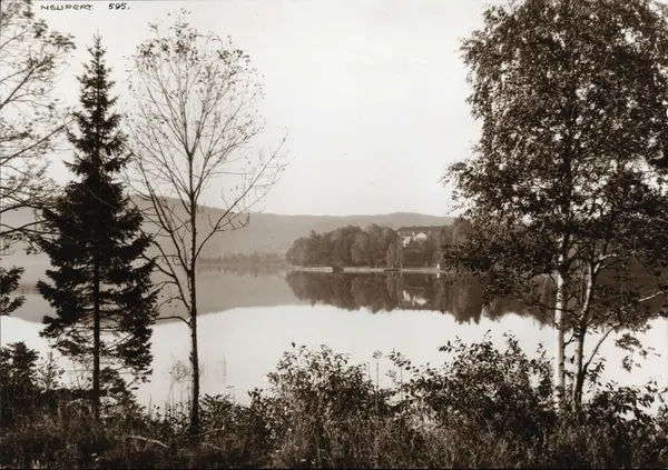 Landskap, Bogstad, Oslo. Oversiktsbilde med Bogstad gård ved Bogstadvannet i bakgrunnen. Oversiktsbilde. Skog. Fotografert av H.C. Neupert (nr.595) ant. 1920.