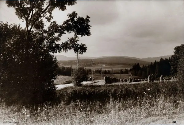 Landskap, Bogstad, Oslo Oversiktsbilde med utsyn over jorder med rader av høystakker. Oversiktsbilde. Veiparti. Fot. H.C. Neupert (nr.597) ant. 1920.