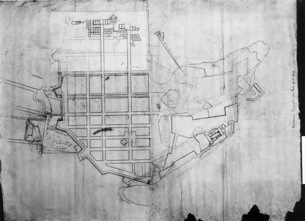 Oslo. Byplan, penn ca. 1780?. Størrelse ca. 64x82 cm. Påført: "Christiania. Byggeplan fra Slutn. af 17. Aarh." Viser bl. a. gater, skanser, festningen og sjøbuer.