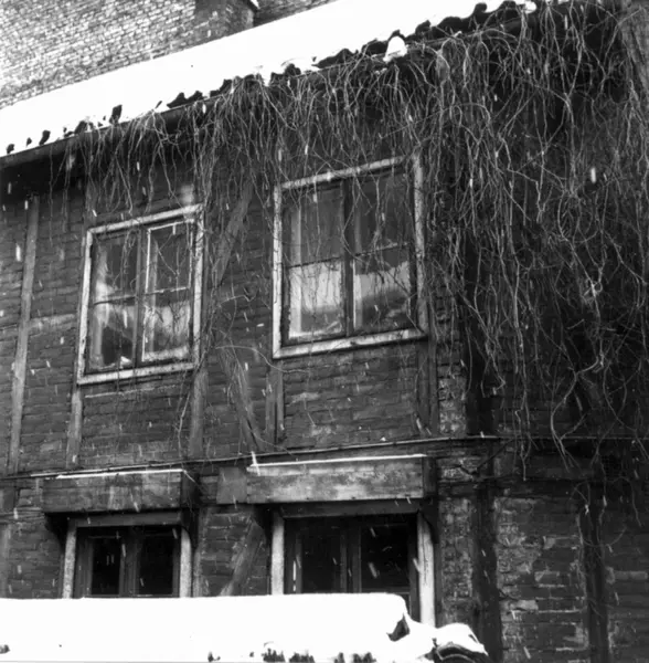 Fred Olsens gate 15, Oslo 1957-58. Mot gårdsrommet, bindingsverkhus. Fotografert under nedriving av nr. 13 som er flyttet til NF. Hus overgrodd med villvin, klesvask.