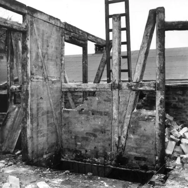 Fra rivingen av Holmens gate 5 i Oslo i Pipervika.Hele denne gata forsvant med Rådhusreguleringen.Bakgården i Holmens gate 5 er bevart på Norsk Folkemuseum, som bygning nr. 231.