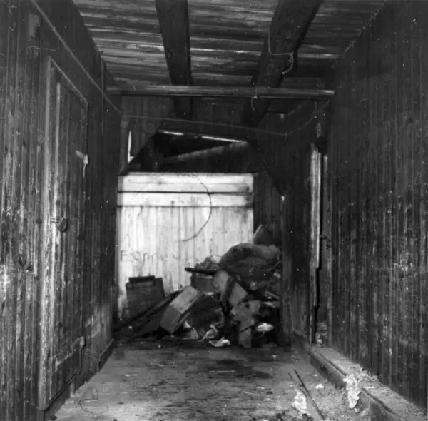 Fra rivingen av Holmens gate 5 i Oslo i Pipervika.Hele denne gata forsvant med Rådhusreguleringen.Bakgården i Holmens gate 5 er bevart på Norsk Folkemuseum, som bygning nr. 231.